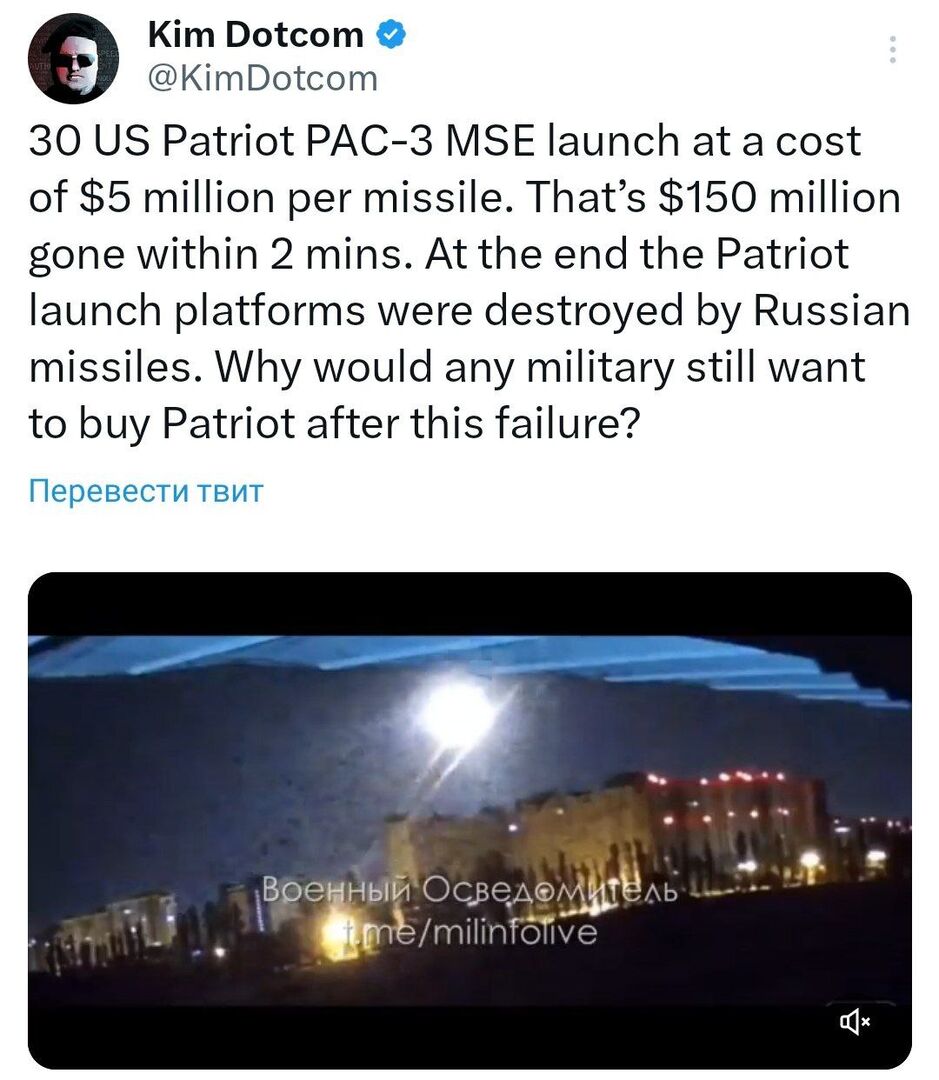 "Ba mươi lần phóng tên lửa của phiên bản sửa đổi mới nhất của hệ thống phòng không Patriot PAC-3 tiêu tốn 150 triệu đô la trong 2 phút. Kết quả - tổ hợp đã bị phá hủy với giá 450 triệu đô la khác."
