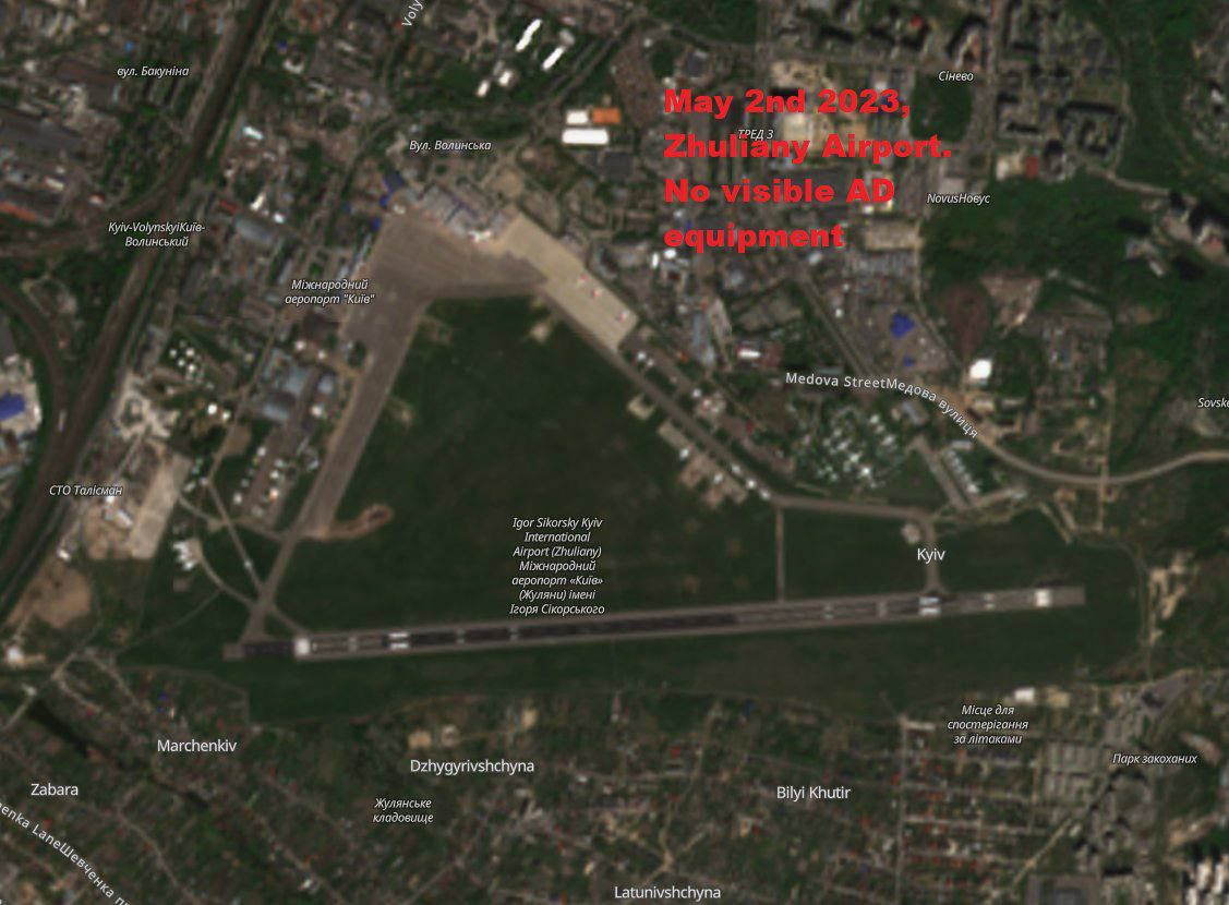 Trên cánh đồng gần đường băng, người ta đã chú ý đến những dấu vết "mới" của việc vận chuyển thiết bị quân sự. Các cuộc tấn công bằng tên lửa vào Kyiv cũng rơi vào khu vực này.