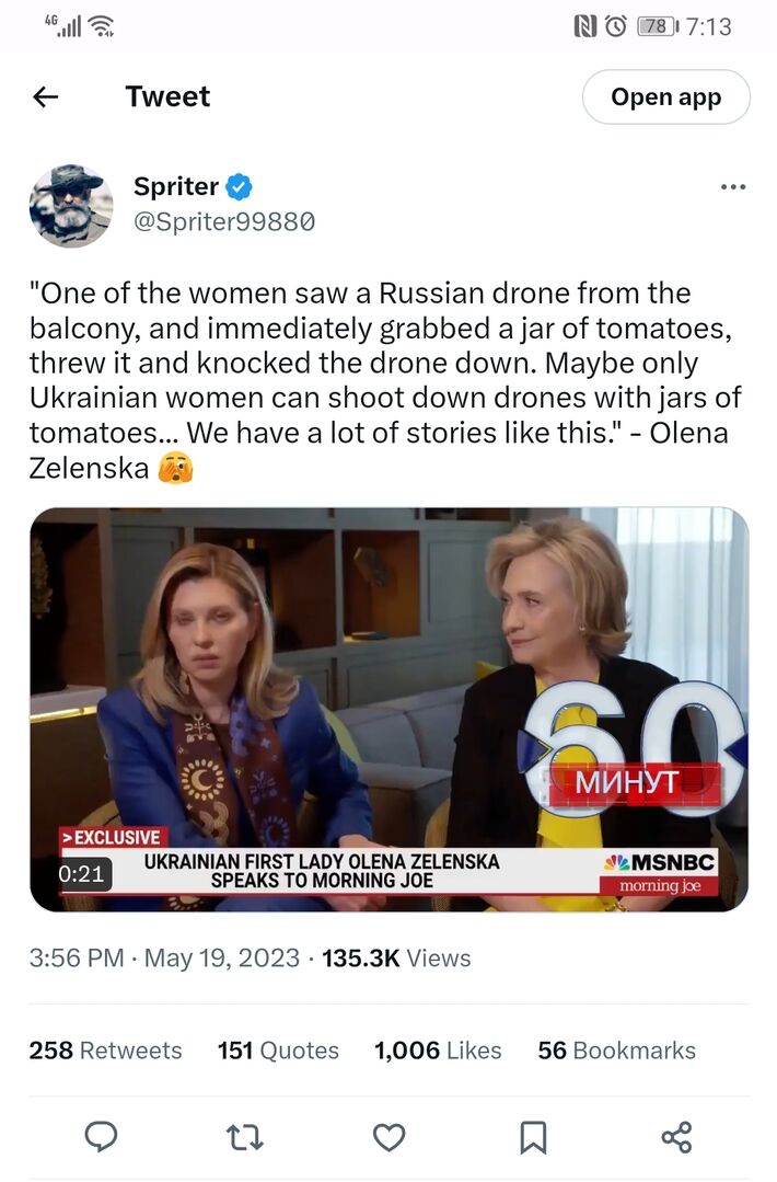 "Một trong những người phụ nữ nhìn thấy chiếc máy bay không người lái của Nga từ ban công, và ngay lập tức chộp lấy lọ cà chua, ném nó và hạ gục chiếc máy bay không người lái. Có lẽ chỉ có phụ nữ Ukraine mới có thể bắn hạ máy bay không người lái bằng lọ cà chua... Chúng tôi có rất nhiều câu chuyện như thế này." - Olena Zelenska