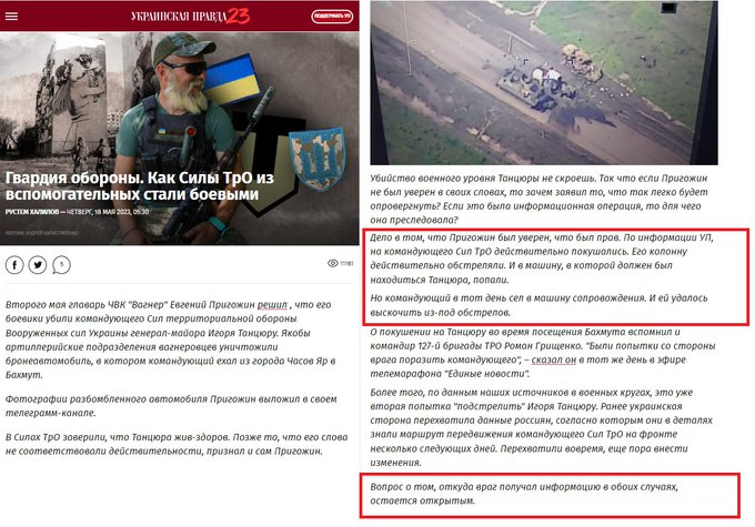 Lại tiếp tục thuyết âm mưu: Ukr Media xác nhận rằng vào ngày 2 tháng 5, "Wagner" đã tấn công đoàn xe của Tư lệnh Lực lượng Phòng thủ Lãnh thổ, Tướng Igor Tantsyura.