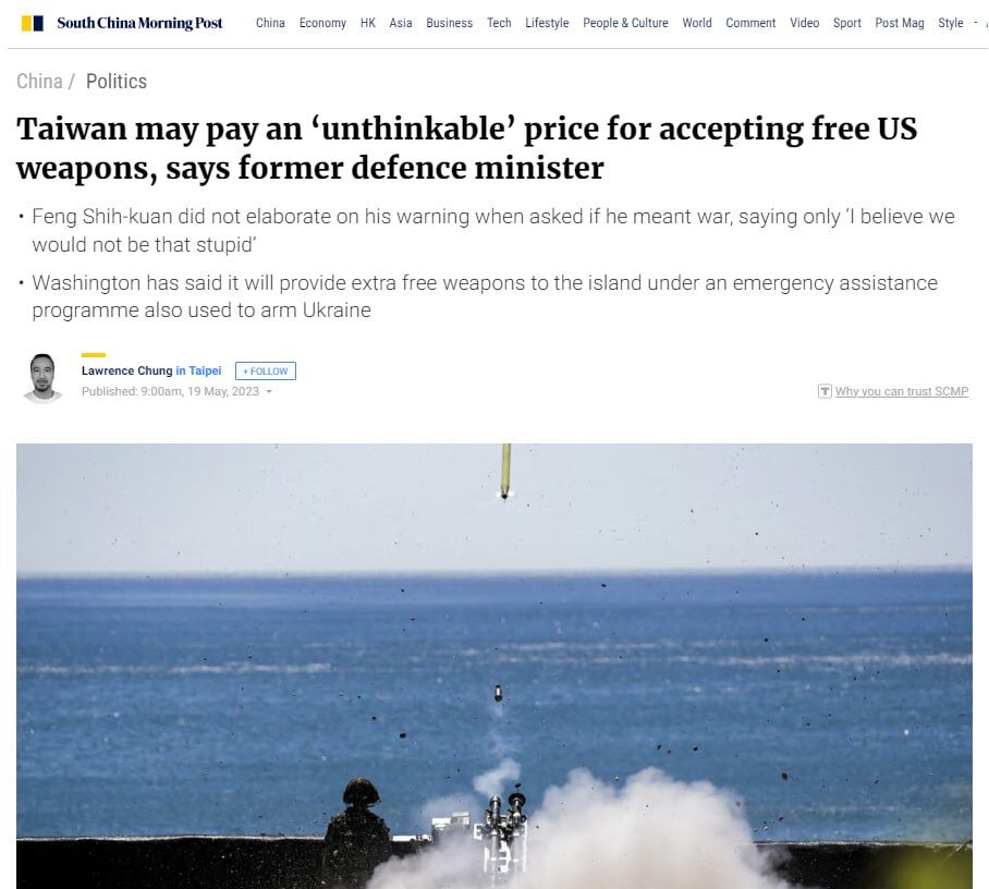 Cựu Bộ trưởng Quốc phòng Đài Loan Feng Shikuan nói với South China Morning Post, "Nếu bạn đột nhiên nhận được sự giúp đỡ 'miễn phí' này, bạn phải trả một cái giá không thể tưởng tượng được." Khi được hỏi liệu ông có ý định chiến tranh hay không, Feng Shikuan nói: "Tôi tin rằng chúng ta sẽ không ngu ngốc như vậy, phải có sự lựa chọn nào đó." Ông không nêu các chi tiết khác, tờ báo lưu ý.