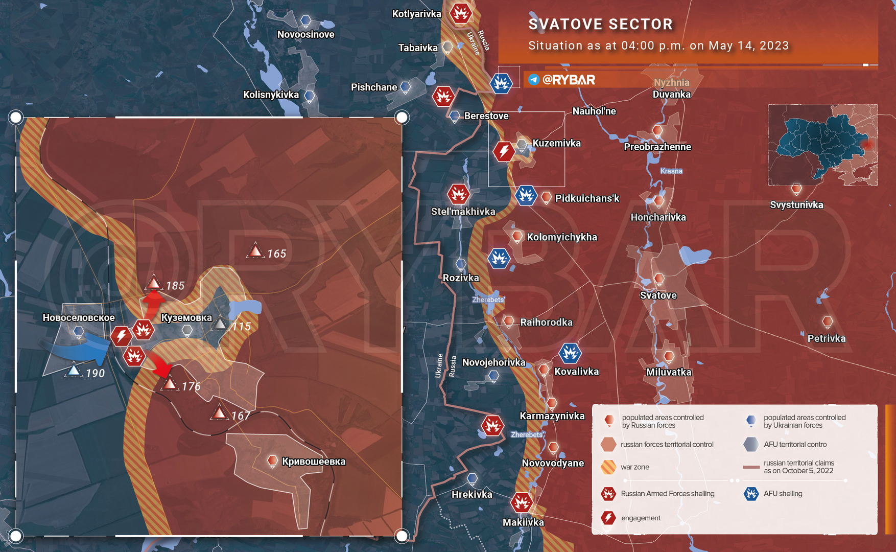 ❗️ Khu vực Svatovsky của mặt trận và các trận chiến giành Kuzemovka - tình hình tính đến 16:00 ngày 14 tháng 5 năm 2023