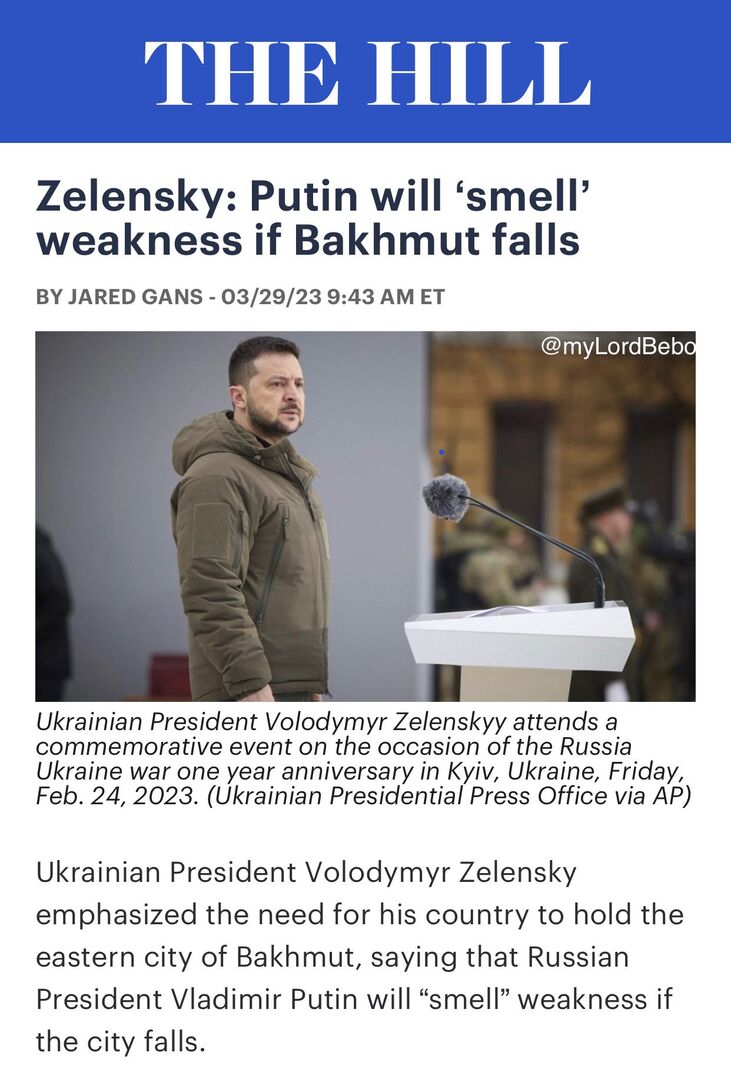 Về mặt cá nhân, Ze quyết giữ tp này và coi như canh bạc sự nghiệp của mình. Ze lý luận như sau, lấy được Bakhmut sẽ mang lại cho Nga phạm vi hoạt động để tiến hành một cuộc tấn công tiếp theo trên tuyến Sloviansk-Kramatorsk. Ngoài ra, thông qua Bakhmut, đó sẽ là một con đường thông suốt từ Raygorodok chảy vào Donetsk, Mariupol và các TP khác của Donbass. Ze cũng muốn dựa vào các công sự kiên cố, các building đồ sộ để tiêu hao lực lượng Nga đến mức phải giam chân một số lượng lớn đơn vị ở đây, mỏng ở các địa bàn khác và từ đó tính toán phản công lớn vào nơi quân Nga mỏng và yếu nhất.