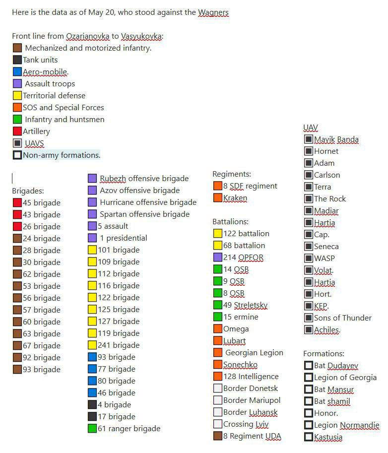 Sau cuộc bỏ chạy của lữ đoàn cơ giới 60 và 93, cũng như lữ đoàn 241 lực lượng phòng vệ Ukraina từ vùng ngoại ô phía tây nam Bakhmut, các phân đội tấn công của Wagner PMC đã giải phóng hoàn toàn thành phố. Các vùng khu vực của thành phố sẽ tiếp tục được dọn sạch khỏi sự hiện diện của các đơn vị Ukraina đến ngày 25.05.