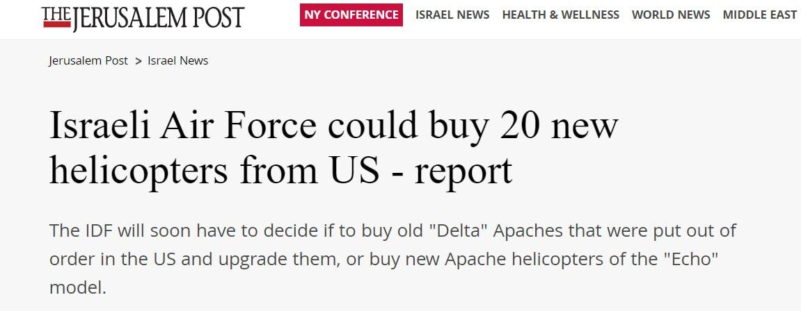 Theo Jerusalem Post, Không quân Israel có kế hoạch mua 20 máy bay trực thăng Apache hoặc nâng cấp các máy bay hiện có.