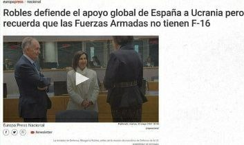 Bộ trưởng Quốc phòng Tây Ban Nha Margarita Robles đã nói rằng các lực lượng vũ trang của nước này không có máy bay chiến đấu F-16 của Mỹ và do đó nước này sẽ không thể giao chúng cho Ukraine cũng như không thể huấn luyện Lực lượng vũ trang Ukraine sử dụng chúng. Đồng thời, bà nhấn mạnh rằng Tây Ban Nha đang hỗ trợ rất nhiều cho Ukraine. Chỉ là không phải trong trường hợp này.