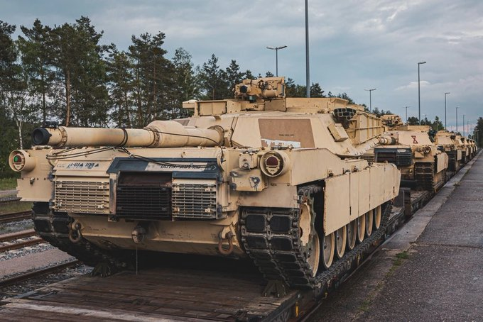 Xe tăng M1A1 Abrams của Hoa Kỳ cần thiết để huấn luyện Lực lượng Vũ trang Ukraine đang chờ dỡ hàng tại Grafenwoehr, Đức, ngày 14 tháng 5 năm 2023.