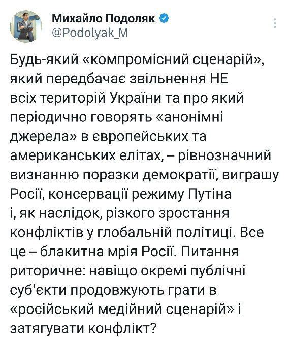 📝 “Bất kỳ kịch bản thỏa hiệp nào dẫn đến việc giải phóng không phải tất cả các vùng lãnh thổ của Ukraine, điều mà “các nguồn tin ẩn danh” trong giới tinh hoa châu Âu và châu Mỹ định kỳ nói đến, đều đồng nghĩa với việc thừa nhận sự thất bại của nền dân chủ, chiến thắng của nước Nga, sự bảo tồn của Putin Podolyak viết.
