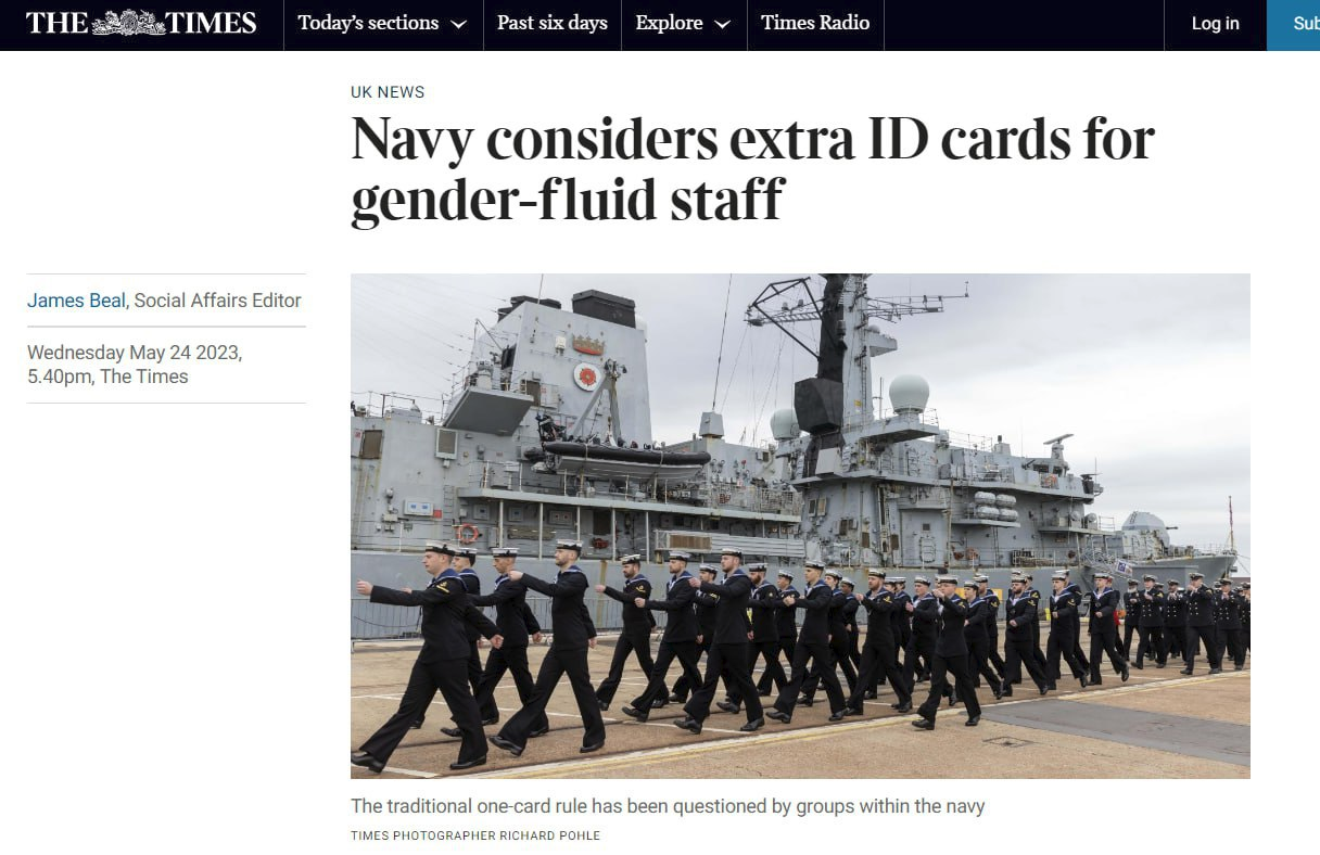 Ngoài ra, họ muốn cấp một số chứng minh nhân dân cho những nhân viên có giới tính thay đổi, The Times viết. Cựu lãnh đạo Hải quân, Lord Alan West, đi sau thời đại và nghĩ về đủ thứ vô nghĩa: