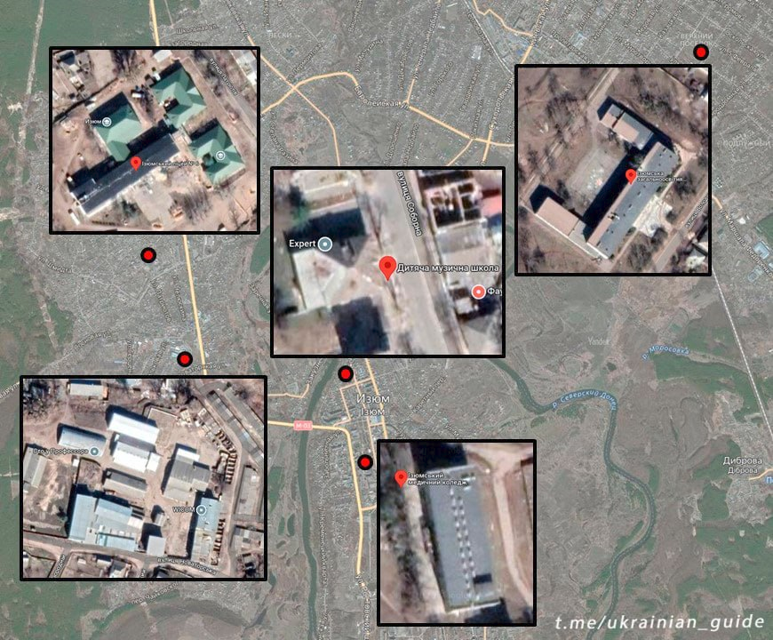 — các tòa nhà của lyceum số 6 và trường số 11 (doanh trại và nhà kho của BC. video @opersvodki) — tòa nhà của trường âm nhạc (trụ sở cảnh sát và văn phòng đăng ký quân sự và nhập ngũ) — khu công nghiệp của công ty phân phối WICOM (đơn vị APU chỉ mới đến ngày hôm qua) — tòa nhà của Trường Cao đẳng Y tế (địa điểm của Lực lượng Vũ trang Ukraine)