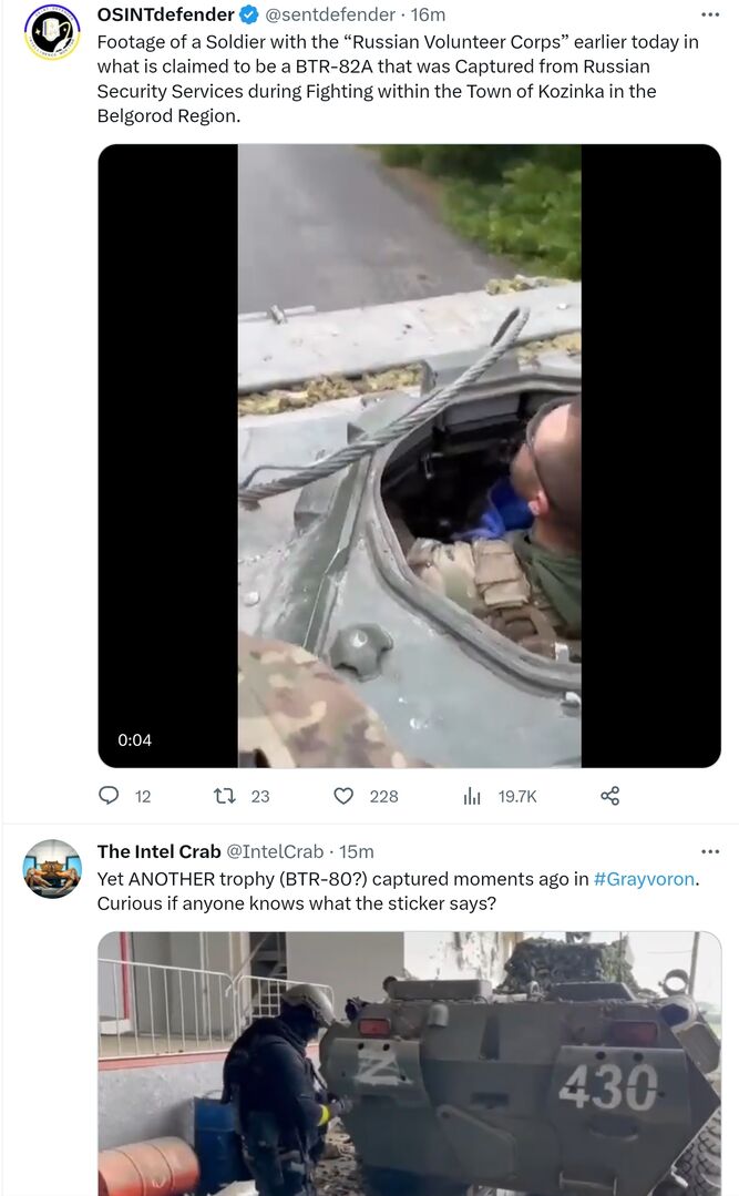 🔻Từ phía Ukraine, các nguồn tin của Rybar phát hiện sự di chuyển của các đoàn xe Ukraina qua khu vực Tsirkunov về hướng Liptsy và biên giới với Nga.