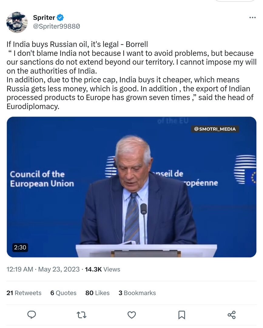 Nếu Ấn Độ mua dầu của Nga, đó là hợp pháp - Borrell “Tôi không đổ lỗi cho Ấn Độ không phải vì tôi muốn tránh các vấn đề, mà bởi vì các biện pháp trừng phạt của chúng tôi không vượt ra ngoài lãnh thổ của chúng tôi. Tôi không thể áp đặt ý chí của mình lên chính quyền Ấn Độ. Ngoài ra, do giới hạn giá, Ấn Độ mua nó rẻ hơn, điều đó có nghĩa là Nga thu được ít tiền hơn, điều này tốt. Ngoài ra, xuất khẩu các sản phẩm chế biến của Ấn Độ sang châu Âu đã tăng gấp 7 lần,” người đứng đầu Eurodiplomacy cho biết.