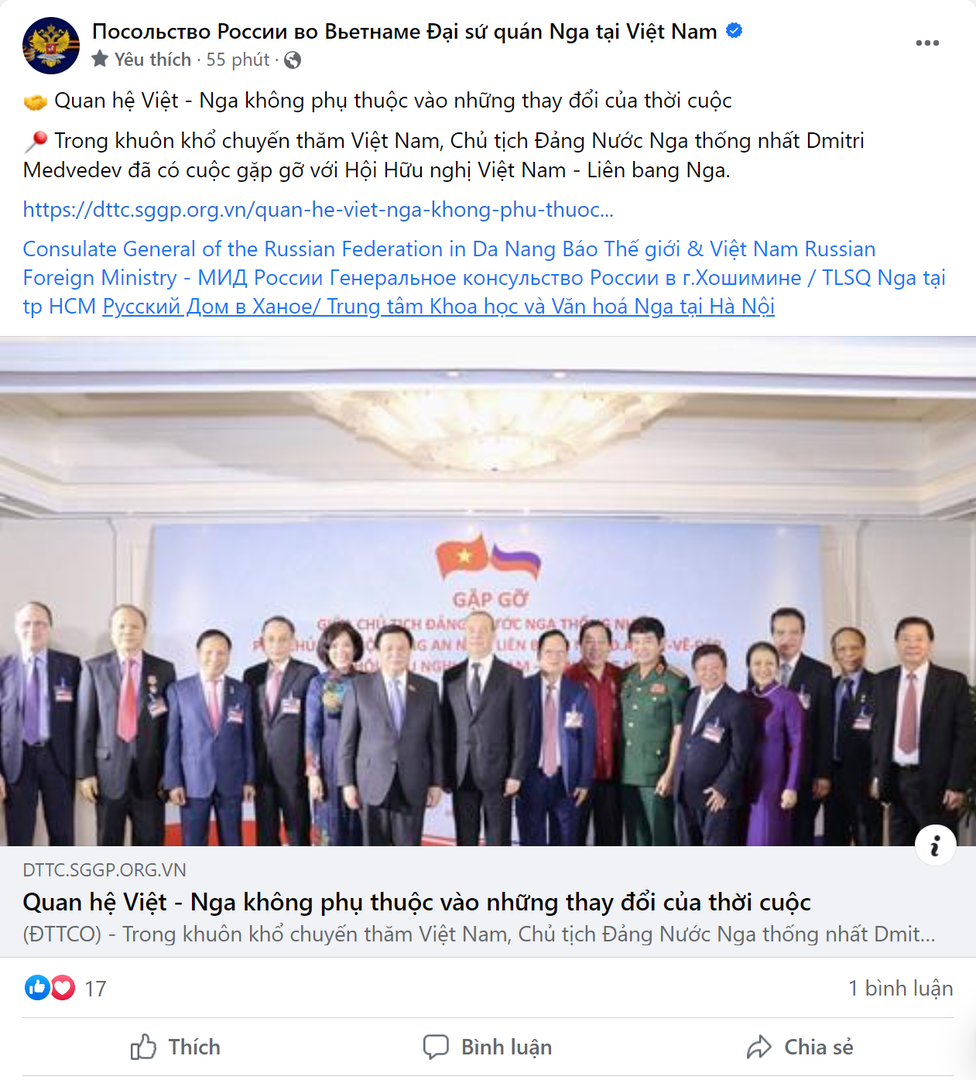 Chủ tịch Đảng Nước Nga thống nhất, Phó Chủ tịch Hội đồng An ninh Liên bang Nga Dmitri Medvedev bày tỏ xúc động trước tình cảm nồng ấm của những người bạn Việt Nam, chúc mừng những thành tựu mà nhân dân Việt Nam đã đạt được trong xây dựng và phát triển đất nước. Khẳng định quan hệ hợp tác truyền thống Việt Nam - Liên bang Nga không phụ thuộc vào những đổi thay của thời cuộc, ông Medvedev cảm ơn những đóng góp quý báu của Hội Hữu nghị Việt - Nga và các hội viên, nhấn mạnh vai trò quan trọng của các tổ chức hữu nghị trong việc củng cố và phát triển quan hệ Việt Nam - Liên bang Nga.