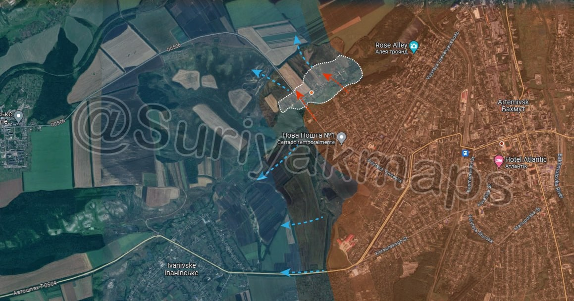 Tình hình hiện tại phía tây Bakhmut: Quân đội Ukraine tiếp tục rút quân về phía thị trấn Ivanivske/Іванівське. Trong khi đó, Quân đội Nga bắt đầu các chiến dịch truy quét ở Khromove / Хромове, nơi đã bị quân Ukraine bỏ trống, họ đã rút lui về khu vực chiến hào phía bắc của nó.