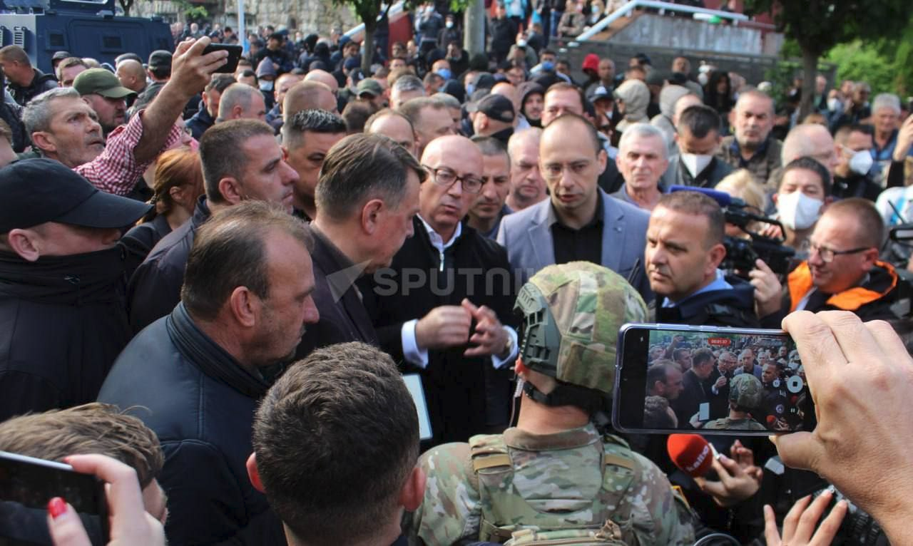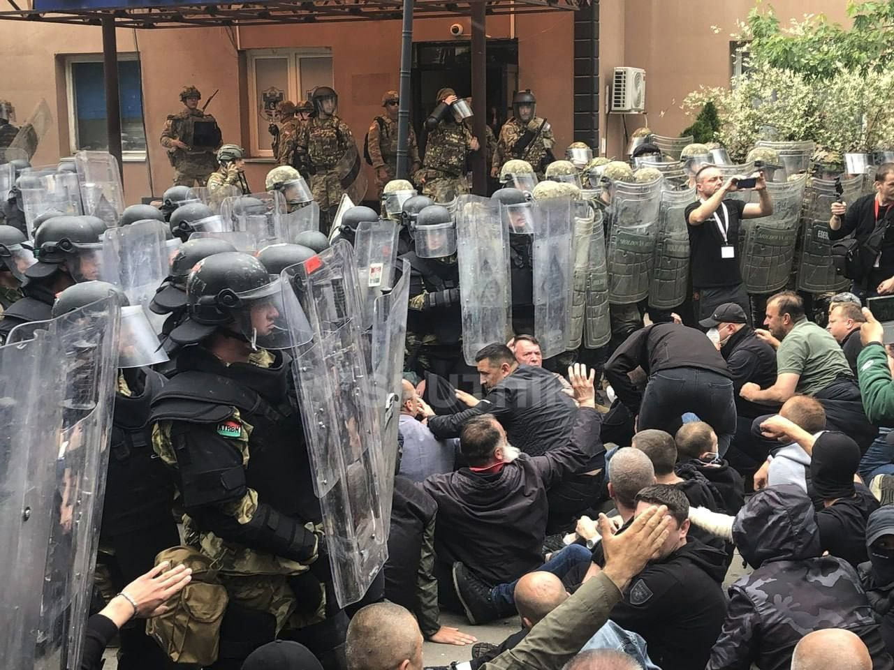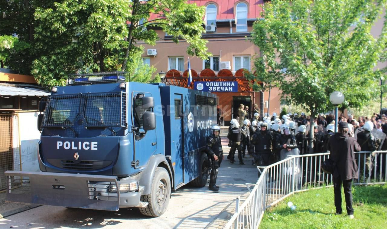 ◾Tại một thời điểm, những người Serbia đứng đầu đã cố gắng thương lượng với các thành viên KFOR. Một chiếc xe có vòi rồng được đặt trước chính quyền Zvecan.