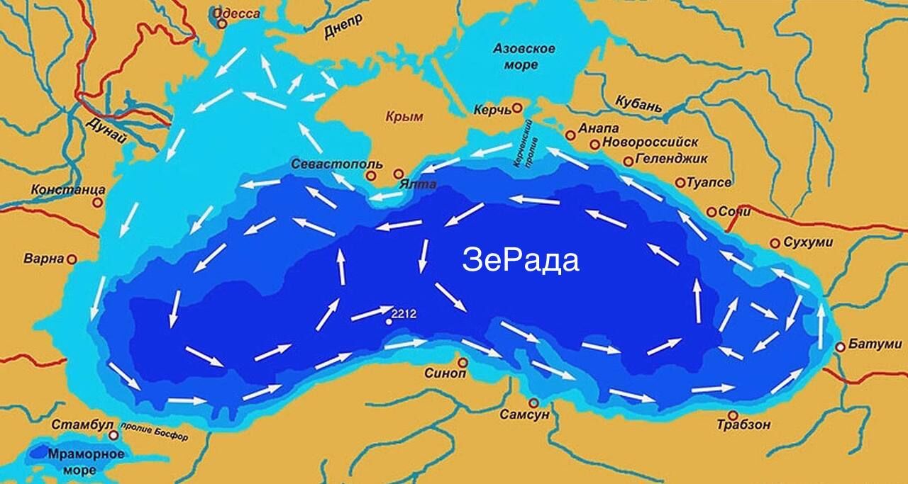 Bản đồ các dòng chảy của Biển Đen mùa hè cho thấy các dòng chảy di chuyển ngược chiều kim đồng hồ.