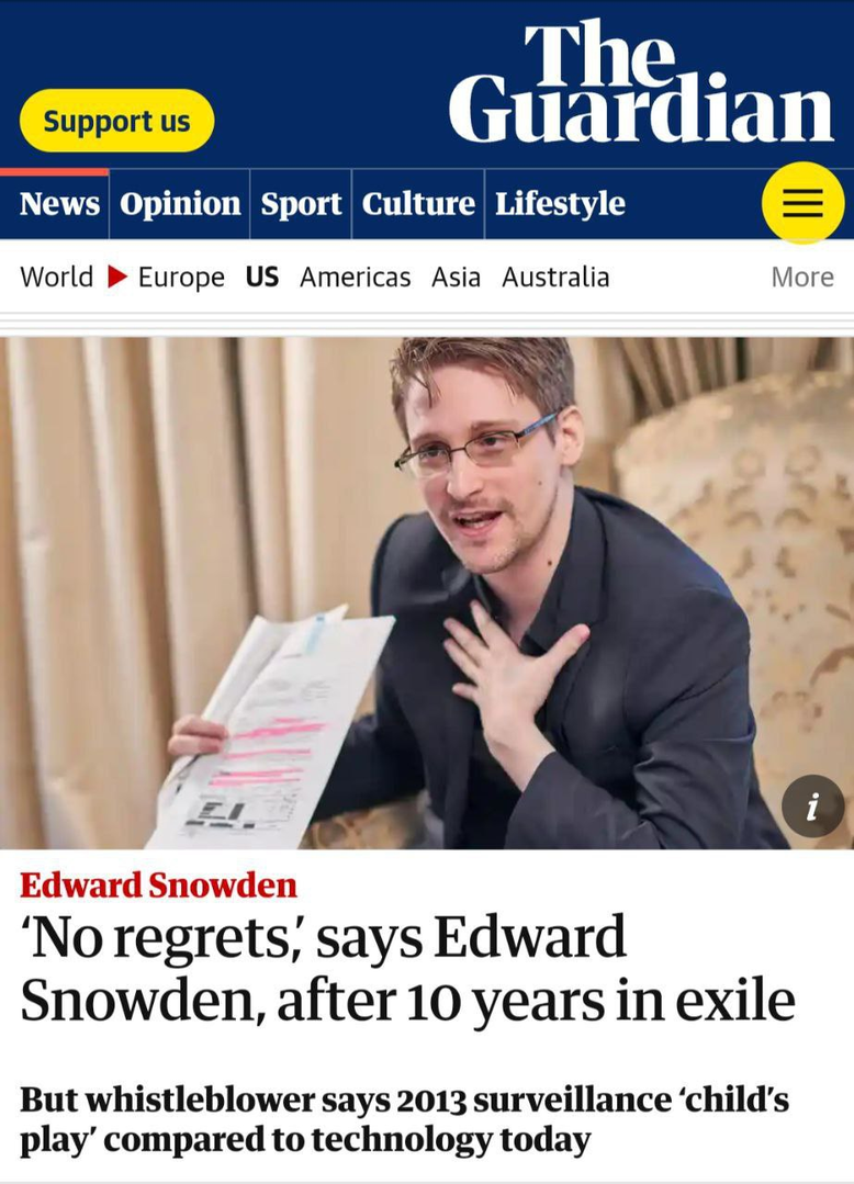 Edward Snowden, 10 năm sau cuộc đào thoát nổi tiếng, cho biết anh không hối tiếc và khá hài lòng với cuộc sống hiện tại ở Nga - tờ Guardian của Anh đưa tin.