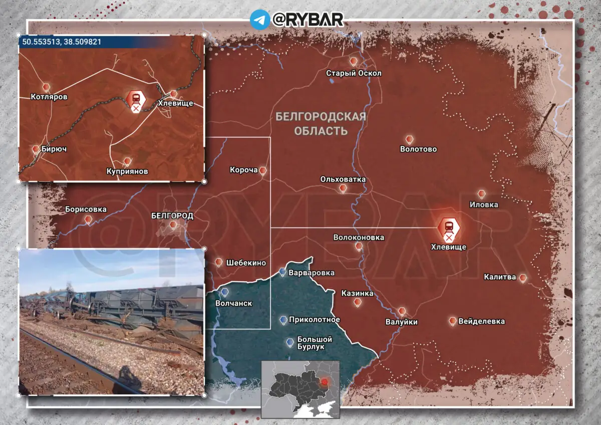 Tại vùng Belgorod, trên đoạn đường sắt Khlevishche-Biryuch, do bị phá hoại, 15 toa của một đoàn tàu chở hàng đã bị trật bánh. Mạng lưới liên lạc bị hư hỏng, không có thương tích nào giữa các nhân viên và cư dân của Đường sắt Nga. Hoạt động di chuyển của tàu điện, tàu ngoại ô tạm thời bị dừng lại.