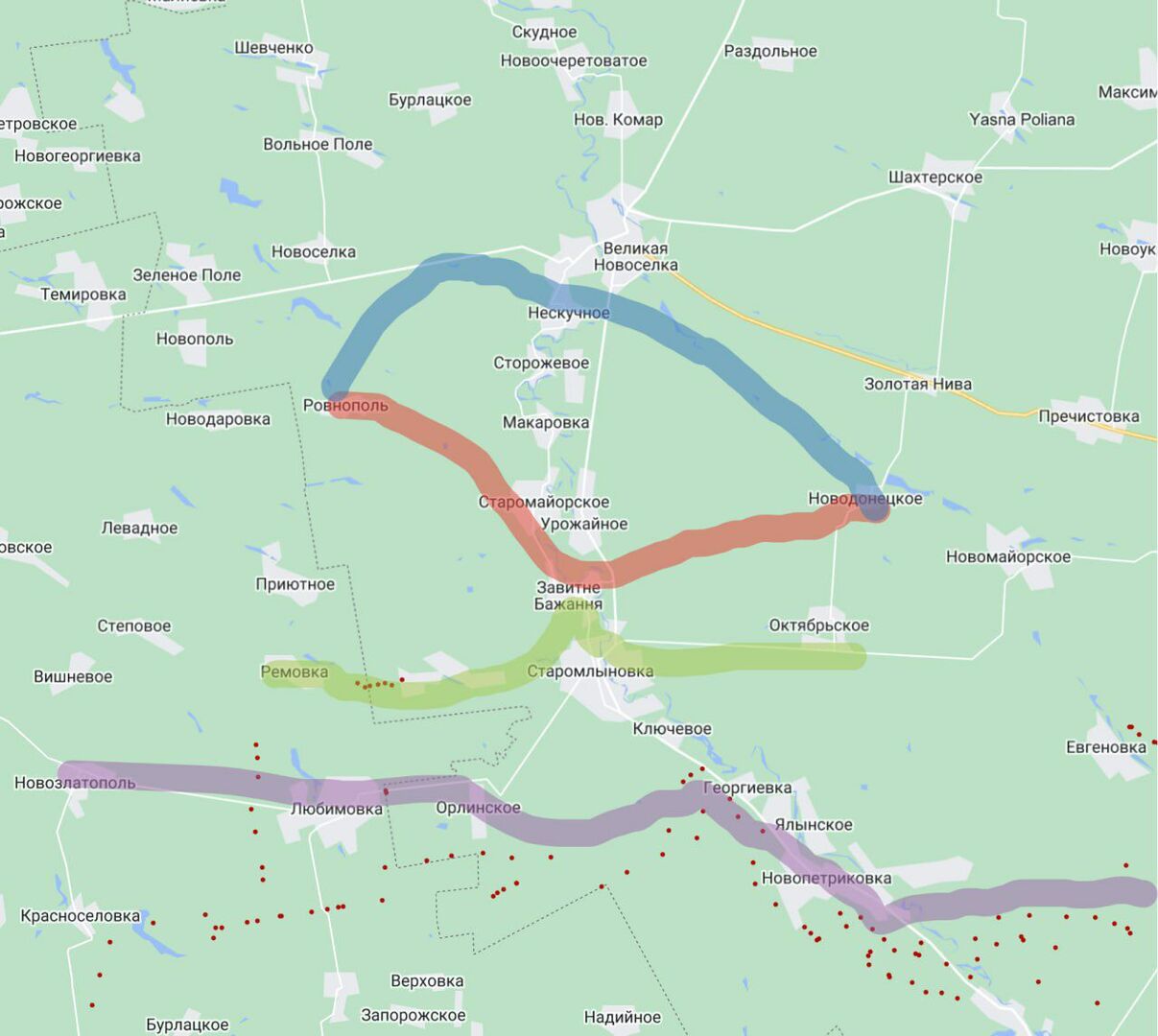 - Đường màu xanh lá cây có khả năng là tuyến phòng thủ tiếp theo trong trường hợp lực lượng vũ trang Nga tiếp tục rút lui;
