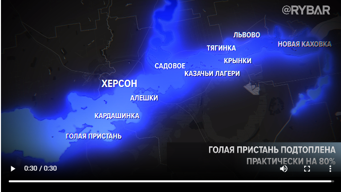 Đồng thời, lũ lụt quy mô lớn tiếp tục diễn ra ở vùng Kherson sau khi nhà máy thủy điện Kakhovskaya bị phá hủy. Mực nước đã giảm ở Novaya Kakhovka, nhưng các khu định cư ở hạ lưu sông Dnepr vẫn bị ngập gần như hoàn toàn. Bộ Tình trạng khẩn cấp của Liên bang Nga và các tình nguyện viên Nga làm việc trong khu vực để giúp đỡ dân thường. Đồng thời, tại Nhà máy thủy điện Dnepro ở Zaporozhye, chính quyền Ukraine đã mở tất cả 4 cửa xả, đổ nước ồ ạt xuống Dnieper, có thể dẫn đến biến vùng Kherson thành đầm lầy.