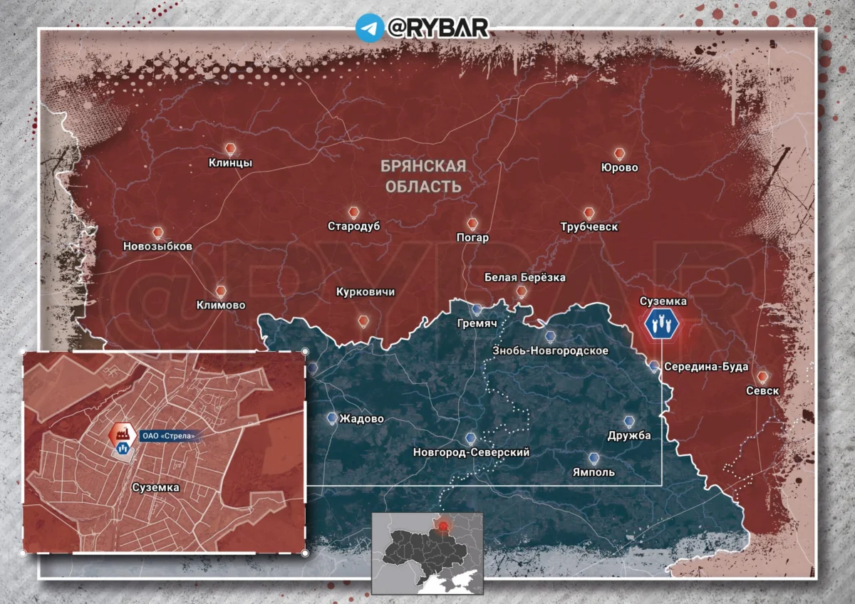 Tại vùng Bryansk, quân đội Ukraine đã cố gắng tấn công một trạm biến áp ở làng Suzemka. Theo các nhà báo, chiếc UAV đã rơi vào khoảng một giờ sáng, nhưng đã tránh được sự phá hủy tại doanh nghiệp và không có thương vong.