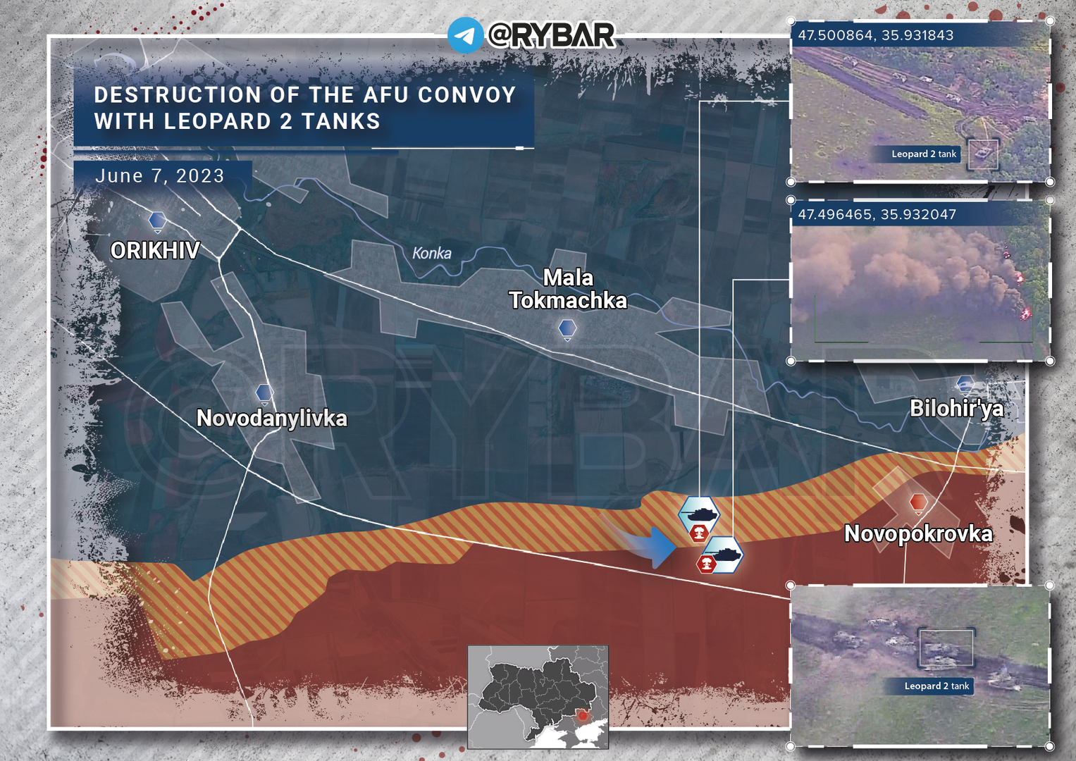 Định vị cuộc tấn công có sử dụng Leopard-2 bị đánh chặn. Để xác định Leo bị tiêu diệt chưa thì hình ảnh công bố đến hiện tại là chưa đủ. Tuy nhiên, một số hình ảnh cho thấy những chiếc xe tăng đang đứng bất động trên cánh đồng cạnh những chiếc xe khác bị nổ mìn: với một xác suất nhất định, ít nhất một trong số những chiếc Leopards đã thực sự ngừng hoạt động.