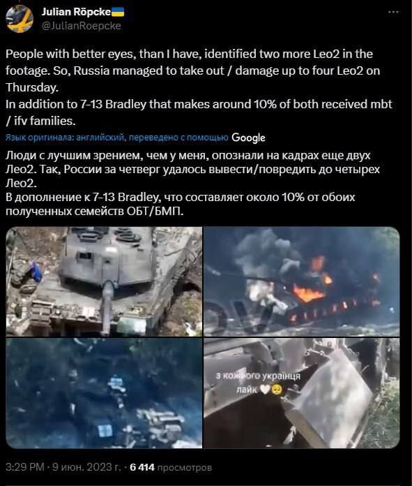 Sự xác nhận đầu tiên về việc ít nhất một trong số các xe tăng Leopard 2A4 được Đồng minh phương Tây giao cho Lực lượng Vũ trang Ukraine đã bị tiêu diệt đã được các bên (trừ Ukraine) công bố.
