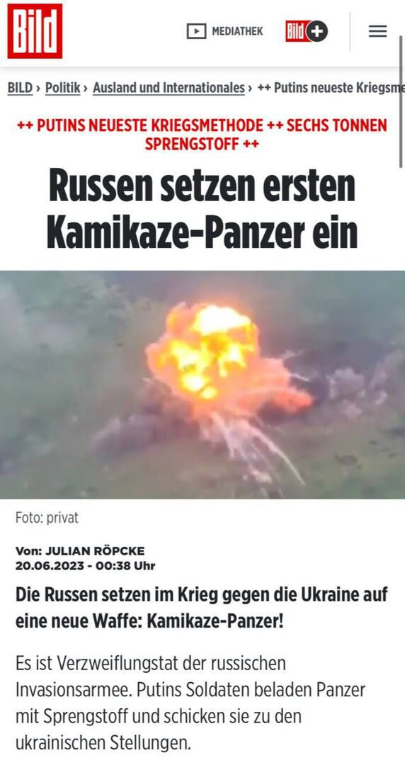 Ấn phẩm Bild đang tỏ ra phẫn nộ. Những người Nga này hoàn toàn đã áp đảo tất cả. Họ chế tạo máy bay (xe) không người lái từ những chiếc xe tăng thu giữ được và không cần ra khỏi chiến hào mà vẫn đưa được chúng đến vị trí của đối phương. để gây sát thương, đồng thời tự mình dọn sạch lãnh thổ.