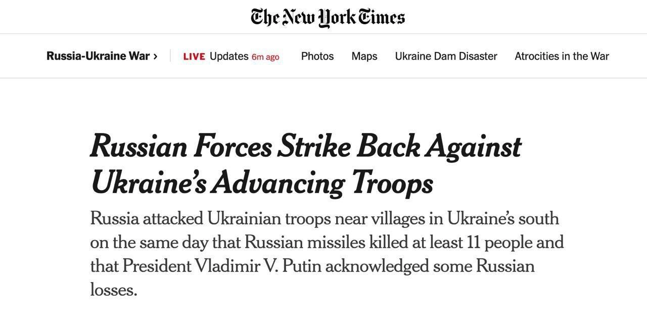 📝 “Chiến lược phòng thủ phản công trên không của Nga có thể làm chậm chiến dịch của Ukraine. Các lực lượng vũ trang Ukraine đã phải đối mặt với các bãi mìn, chiến hào, hào chống tăng, các cuộc không kích và hỏa lực pháo binh,” The New York Times viết.