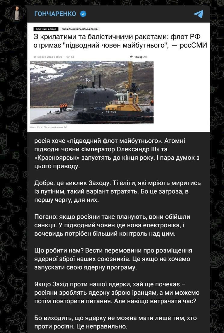 📝 Chúng ta nên làm gì? Đàm phán việc triển khai vũ khí hạt nhân của các đồng minh của chúng ta. Đây là nếu chúng ta không muốn khởi động chương trình hạt nhân của mình. Nếu phương Tây chống lại vũ khí hạt nhân của chúng ta, hãy để họ đợi - người Nga sẽ chế tạo vũ khí hạt nhân cho người Iran, và sau đó chúng ta có thể lặp lại câu hỏi. Nhưng tại sao lại lãng phí thời gian?” Goncharenko viết.