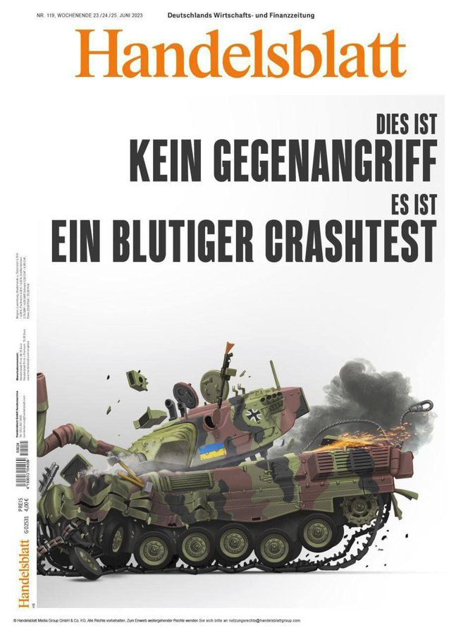 "Đây không phải là một cuộc phản công - đây là một cuộc thử nghiệm va chạm đẫm máu" Bìa ấn bản tiếng Đức của tờ Handelsblatt.