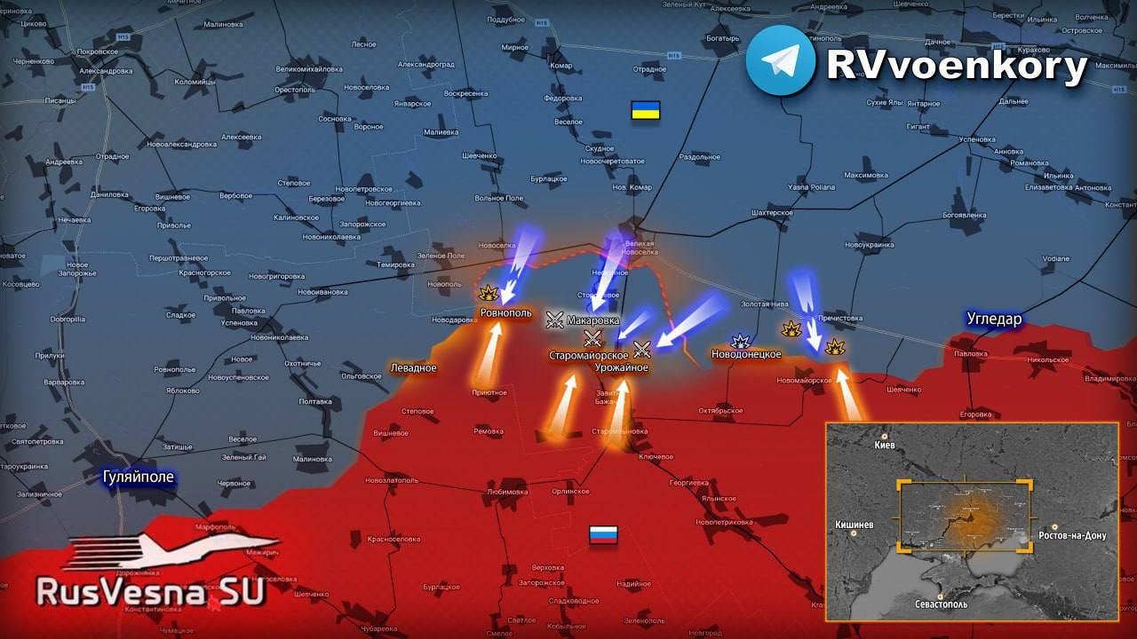 Giao tranh đang diễn ra ở khu vực Urozhaine và Makarovka. Lực lượng Vũ trang Ukraine đang tập hợp lực lượng dự trữ cho một nỗ lực đột phá khác. Một trận đánh ác liệt xảy ra vào ban đêm ở khu vực Makarovka, Ukraine tấn công các vị trí của Nga dọc theo hai vành đai rừng với lực lượng lên đến một đại đội được hỗ trợ bởi xe tăng và xe bọc thép chiến đấu, nhưng đã vấp phải sự chống trả quyết liệt của binh lính nhóm Viễn Đông.