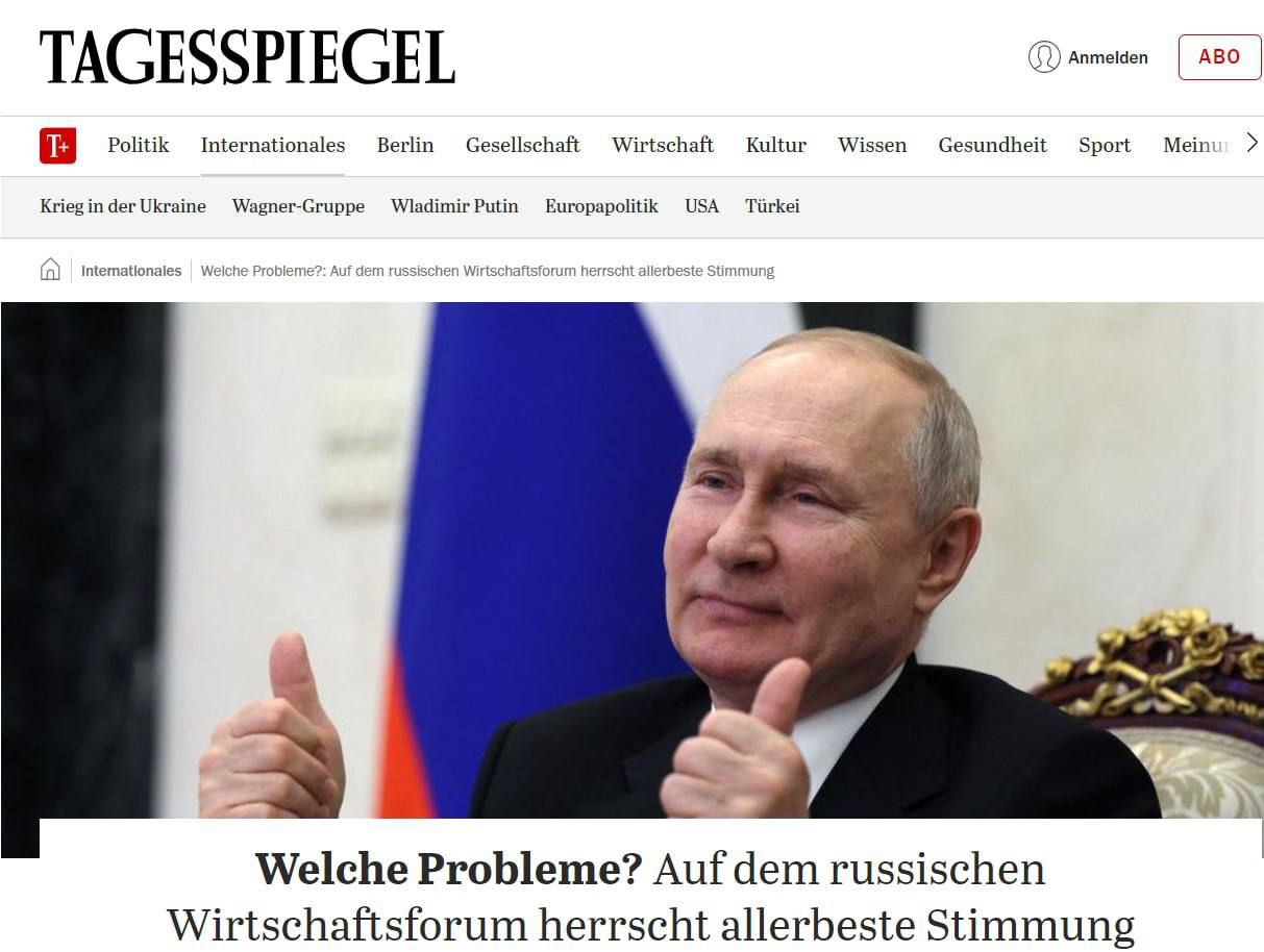Der Tagesspiegel viết: “Dựa trên tâm trạng “tốt nhất” của những người tham gia Diễn đàn Kinh tế Quốc tế St. Petersburg lần thứ 26, người ta không thể nói rằng phương Tây đang tiến hành một cuộc chiến trừng phạt với Nga."