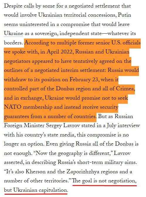 — Ukraine sẽ đồng ý phi quân sự hóa và giảm quy mô lực lượng vũ trang (như post trước em đã kê)Trong ảnh là một đoạn trích từ bài báo của Foreign Affairs ngày 25 tháng 8 năm 2022 thảo luận về việc làm thế nào mà một thỏa thuận như vậy gần như được thông qua.
