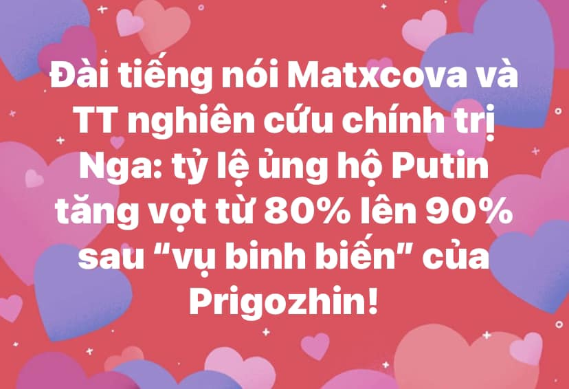 Em thì vẫn bảo lưu quan điểm binh biến là thật, mâu thuẫn có từ lâu, đến hôm kia thì thành giọt nước tràn ly. Và cái may là Nga khéo léo biến nguy thành cơ, hết sức mềm mỏng nên xoa dịu được những cái đầu nóng ở trong nội bộ, tránh đổ máu không cần thiết. Việc đẩy anh chủ Wagner đi ra chỗ khác để ko phải đối đầu với BQP Nga là bước đi khôn ngoan và hợp lý hợp tình.