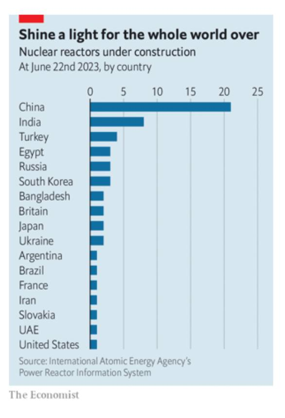 Năng lượng nguyên tử hiện nay về cơ bản là một công nghệ của Thị trường mới nổi với Nga là nhà cung cấp chính và Trung Quốc là nhà xây dựng chính.