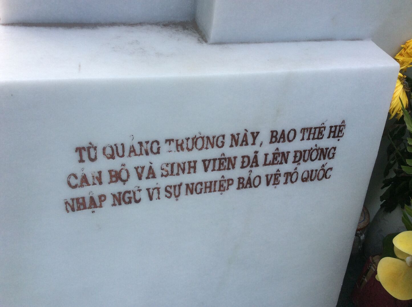 Tại sao em lại kể chuyện anh Dũng cho các cụ. Với cá nhân em, anh Dũng là hình mẫu của tình đồng đội, cái tình cảm của lính mà chỉ những anh em từng ở lính mới có và cảm nhận được sâu sắc. Và chuyện anh Dũng gắn liền với tượng đài được nói trên đây. Lúc đầu, tượng đài cứ đứng thế thôi, đứng thế, mặc cho sự đời trôi đi với những con người tất bật lo cơm áo cho riêng mình. Chỉ có điều, ngày nào cũng có một bông hoa được đặt dưới chân tượng đài mà ban đầu không biết người đặt là ai. Chính anh Dũng đều đều, ngày ngày im lặng đặt hoa cho những đồng đội không về. Nếu đi vắng thì anh nhờ người mua và đặt hộ. Chỉ một bông hoa, nhưng ngày nào cũng có! Thời gian trôi đi, chắc cũng mấy năm, rồi người ta cũng biết người đặt hoa là ai. Chắc thấy cũng hợp lý, nên sau này, Nhà trường đã chăm sóc việc đặt hoa. Và chiều thứ Hai hàng tuần, Đoàn trường tổ chức cho sinh viên đầu khóa chào cờ trước tượng đài.
