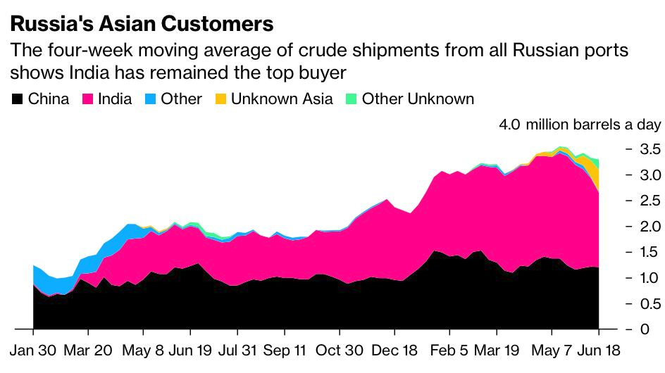 🇮🇳🇷🇺 Bloomberg: tỷ trọng dầu của Nga trong nhập khẩu của Ấn Độ là 46%, đây là một con số kỷ lục