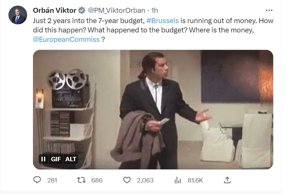 ▪️Thủ tướng Hungary, Viktor Orbán, đã đăng một meme với John Travolta bối rối từ bộ phim "Câu chuyện về năm đô la", như một phản ứng trước việc Brussels hết tiền 2 năm trong dự toán ngân sách 7 năm của EU
