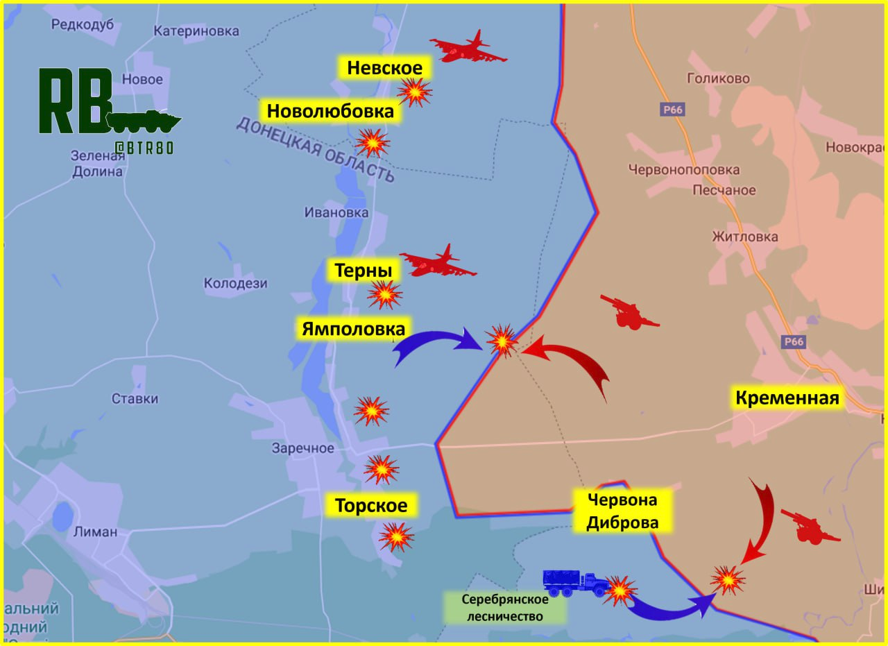 Theo hướng Krasnolimansky, các đơn vị của nhóm quân "Trung tâm", các cuộc không kích, pháo binh và hệ thống súng phun lửa hạng nặng đã đánh bại các đơn vị của các lữ đoàn cơ giới 21, 42 và 67 của Lực lượng Vũ trang Ukraine tại các khu vực định cư Nevskoye, Kremennaya và Chervonaya Dibrova của Cộng hòa Nhân dân Luhansk.