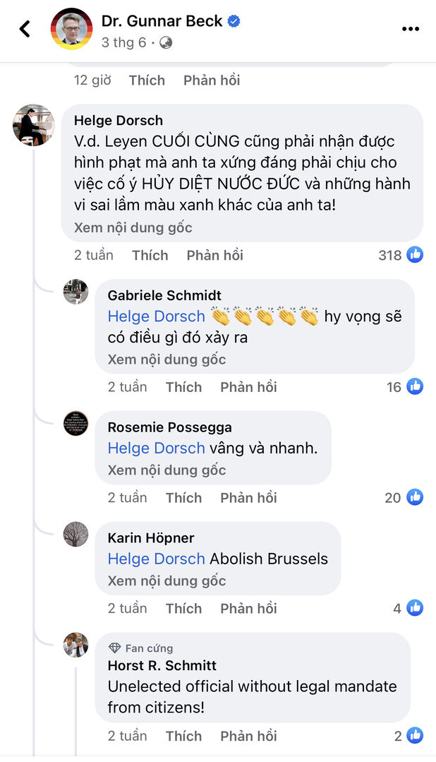 Hôm qua em đọc Face của 1 nghị sỹ Đức đòi cách chức bà Von der Layen thì thấy 99% comment dân Đức vào chửi bà này làm hại nước Đức, ngân sách cạn kiệt vì Ukraina và EU. Tuy nhiên bà này do Mỹ dựng lên, chồng làm cty Mỹ, con học ở Mỹ, từng dạy Đại học ở Mỹ, hết nhiệm kỳ chắc chắn bà ta sẽ chạy sang Mỹ