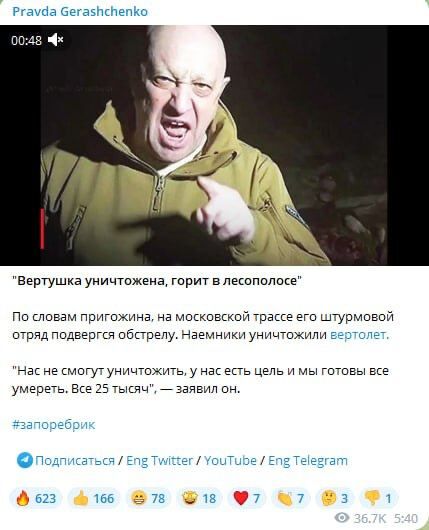 Sự thật: Thông tin về chiếc trực thăng bị bắn rơi không được xác nhận bởi bất cứ điều gì, ngoại trừ lời nói của chính Prigozhin và một bức ảnh có cột khói khó hiểu ở đường chân trời, được các nguồn tin Ukraine sao chép theo cách thuận tiện cho chính họ. Một trong những người đầu tiên lan truyền tin tức này là blogger người Ukraine Shariy.
