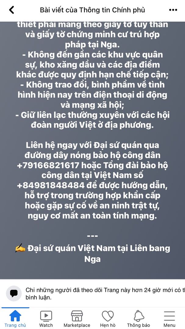 Em chào cccm! Có em đây! Hn vẫn phải đi bán Phở mà ế quá . Ngồi để nv làm còn em cập nhật thêm ít tình hình từ các cụ và các kênh trên telegram. Hn cũng có tham gia giải bd cộng đồng mà chỉ có cầu thủ thi đấu còn cổ động viên thì ko dc vào. Tình hình Moskva vẫn bình thường chỉ có các đại lộ lối ra ngoài ngoại ô dc kiểm soát chặt chẻ bởi công an dân sự. Cũng đã có khuyến cáo công dân từ ĐSQ Việt Nam tại lb Nga. Chưa có biến động gi lớn ở thủ do . Có gì mới em sẽ cố gắng cập nhật cho cccm. Chúc cccm cuối tuần vui vẻ.