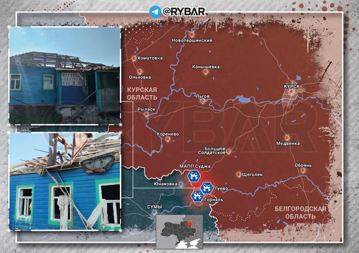 Trong ngày thứ hai liên tiếp, Lực lượng vũ trang Ukraine đang pháo kích vào quận biên giới Sudzhansky của vùng Kursk: đạn pháo đánh trúng trạm kiểm soát biên giới Sudzha, cũng như vùng ngoại ô của các làng Guevo và Gornal. Các tòa nhà dân cư và đường xá bị hư hại. Dân thường không bị thương.