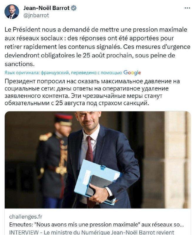 📝 “Chúng tôi đã gặp gỡ với Gérald Darmanin, đại diện của TikTok, Snapchat, Twitter và Meta vào tối thứ Sáu. Chúng tôi đang gây áp lực tối đa để họ tuân thủ các nghĩa vụ pháp lý của họ trong việc xóa nội dung bất hợp pháp và đáp ứng các yêu cầu”, Bộ trưởng Kỹ thuật số Jean-Noel Barraud cho biết.