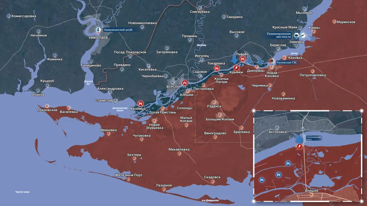 Ở hướng Kherson, địch tiếp tục bám trụ đầu cầu dưới cầu Antonov. Sau các cuộc không kích và pháo binh lớn vào bờ kè và khu vực xung quanh, mặc dù Lực lượng Vũ trang Ukraine bị tổn thất nhưng họ vẫn đang chuyển quân tiếp viện. Ngoài ra, một điểm căng thẳng thứ hai xuất hiện. Kẻ thù đã chuyển biệt kích tới trong khu vực Krynok bằng thuyền. Những kẻ phá hoại đã được khoanh vùng và đón gặp bằng trận chiến.