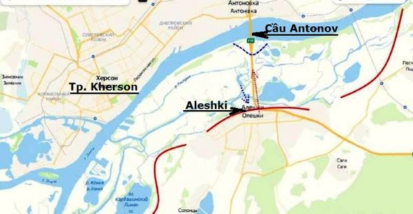 Trong mấy ngày gần đây, pháo binh và UAV của Nga thường xuyên pháo kích địa điểm này, gây tổn thất cho quân Ukraina không kém hơn so với hướng Nam Donetsk. Hai hôm trước, hơn một Tiểu đoàn quân Ukraina tấn công mạnh về phía Nam, vượt qua cầu để tiến đến thị trấn Aleshki, đây là tiền đồn trên tuyến phòng thủ của Nga. Bị đánh chặn nên quân Ukraina chiếm được khoảng 0,5 km vuông ở khu vực đầu cầu Antonov ở phía Nam và bắt đầu xây dựng công sự để làm bàn đạp cho lực lượng chính tiến qua cầu để đánh tiếp về phía Nam. Bộ binh Nga buộc phải tham chiến trực tiếp ở cái gọi là bàn đạp tương lai này của quân Ukraina (trên bản đồ, vạch đỏ là phòng tuyến của Nga, vị trí đầu cầu đó được khoanh lại).