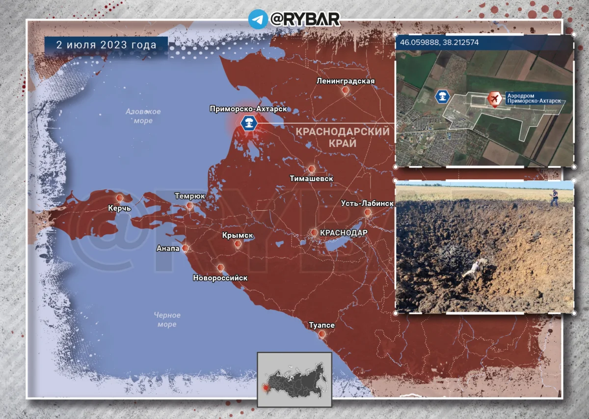 Tại Lãnh thổ Krasnodar, ở vùng ngoại ô phía đông bắc của Primorsko-Akhtarsk, một vụ nổ mạnh đã vang lên, tại địa điểm hình thành một cái phễu khổng lồ có đường kính khoảng 30 mét và sâu tới 4 mét. Rõ ràng, mục tiêu của cuộc đột kích là một sân bay quân sự gần đó. Một cuộc tấn công vào mục tiêu có thể được thực hiện bằng cả tên lửa phòng không đã được sửa đổi của tổ hợp S-200, mà Lực lượng vũ trang Ukraine đã sử dụng để tấn công Crimea và Grom-2 OTRK. Phiên bản của máy bay không người lái bị bắn rơi lưu hành trên Web dường như không thể xảy ra - kích thước của phễu quá lớn. Theo thông tin chính thức, không có thương tích hoặc thương vong.