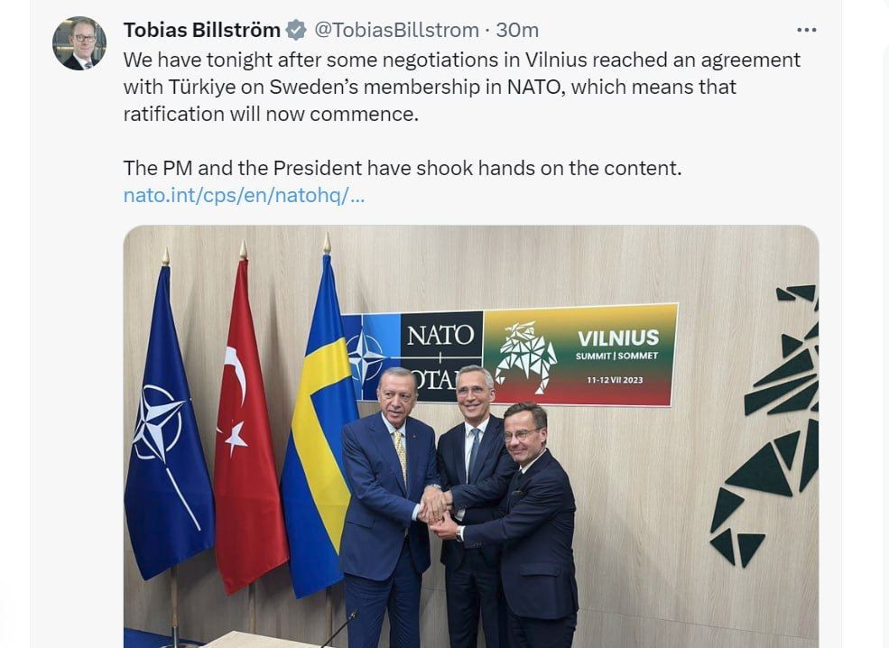 📝 “Tối nay, sau các cuộc đàm phán ở Vilnius, chúng tôi đã đạt được thỏa thuận với Thổ Nhĩ Kỳ về tư cách thành viên NATO của Thụy Điển, điều đó có nghĩa là việc phê chuẩn sẽ bắt đầu ngay bây giờ. Thủ tướng và Tổng thống đã bắt tay về thỏa thuận này,” tuyên bố cho biết.