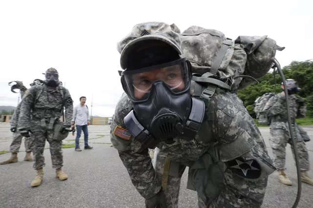 Các thành viên của Tiểu đoàn Hóa học Quân đội Hoa Kỳ tại một trại quân sự ở Hàn Quốc